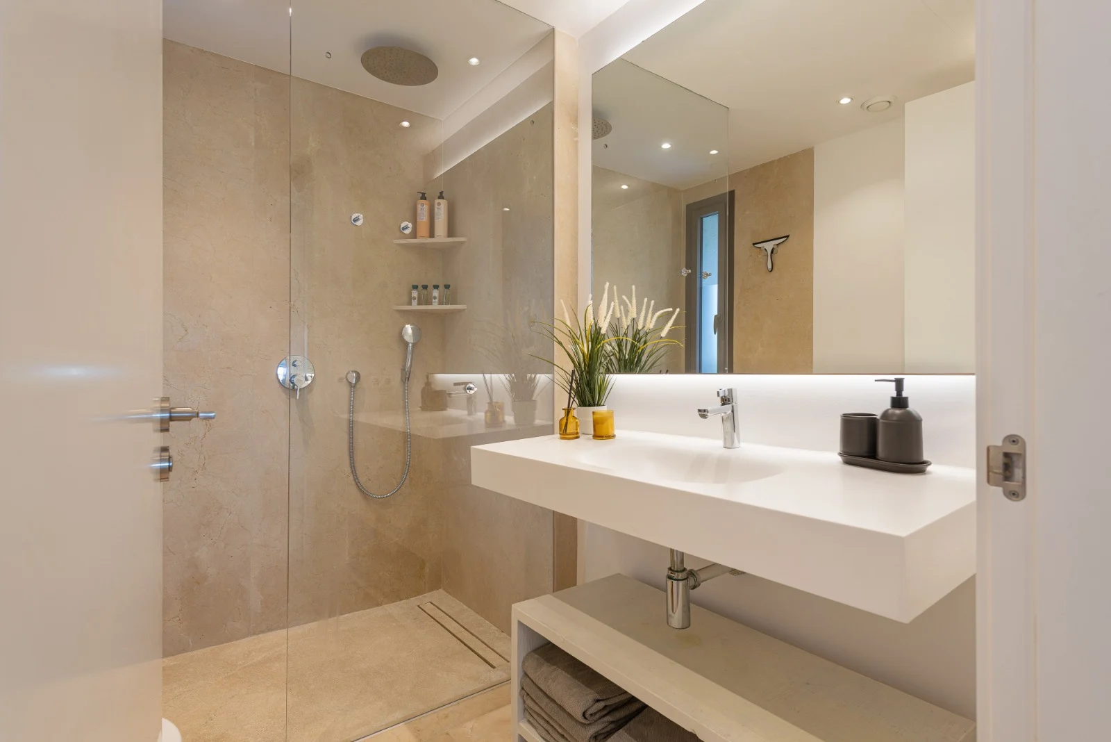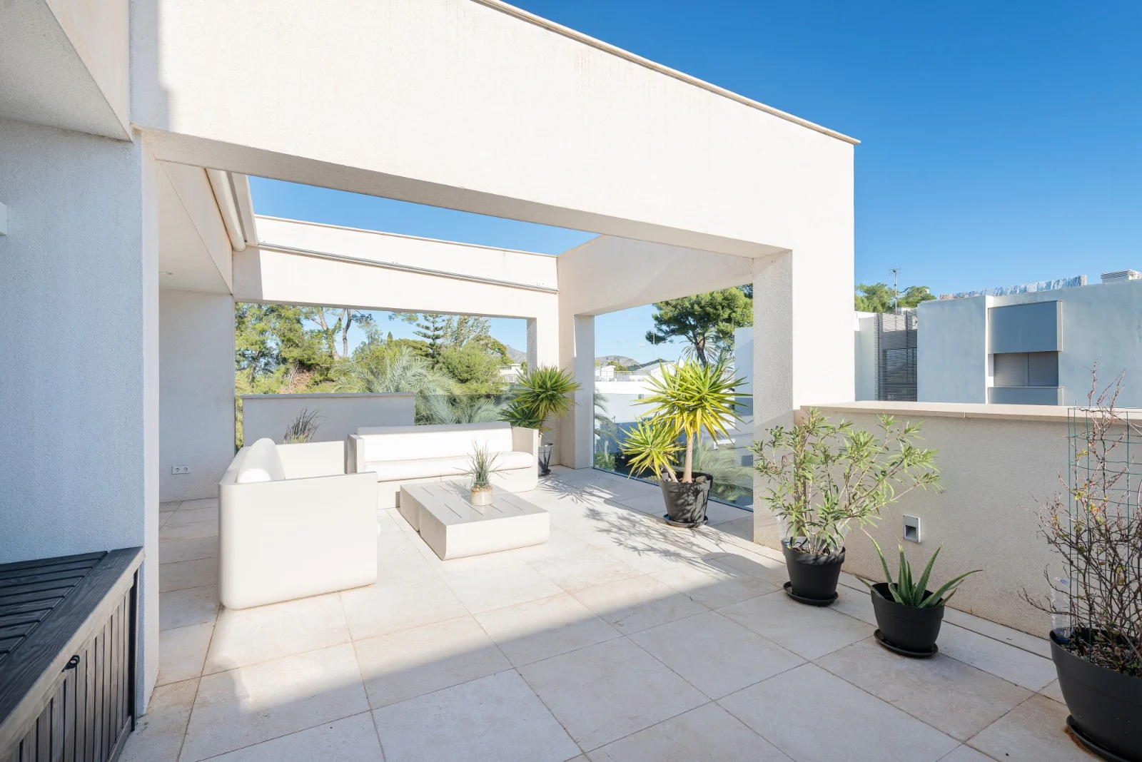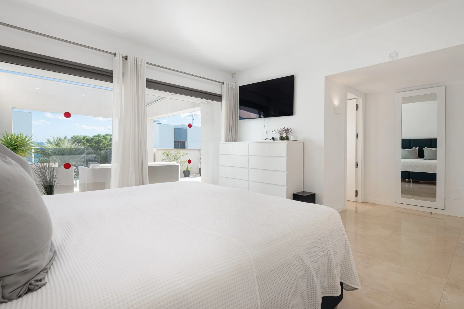 The highlight of the property are its expansive private terraces with sea views. The large rooftop terrace features a refreshing private pool, complete with sun loungers and additional seating areas.