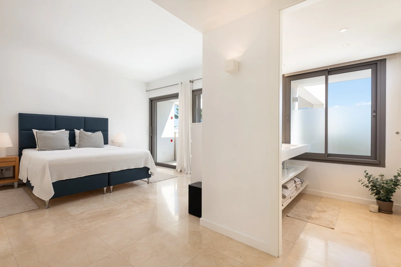 The master bedroom features a luxurious double bed, direct terrace access through large glass doors, and a spacious ensuite bathroom complete with a shower and a freestanding bathtub.