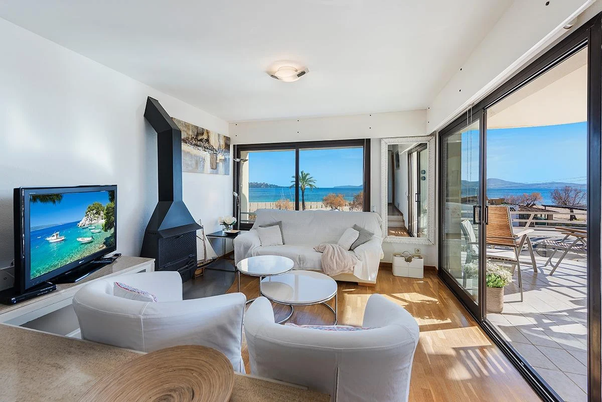 The apartment comfortably accommodates up to 6 guests and is designed to make the most of its exceptional setting. The spacious living room opens onto a private balcony through wide glass sliding doors, while additional sea-facing windows flood the space with natural light. From here, enjoy uninterrupted views of the beach, sea, and mountains—a truly special backdrop whether you’re relaxing indoors or outside.