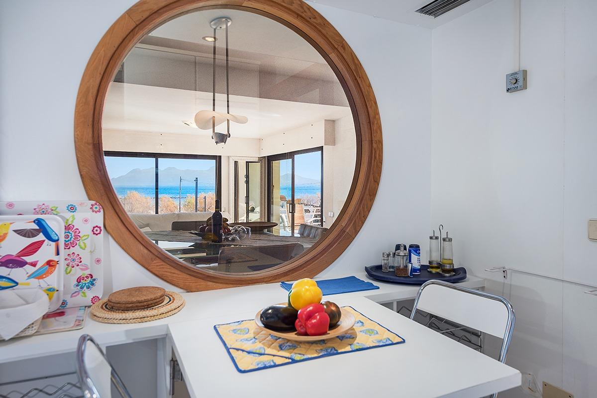 Inside, the living area offers comfortable sofas and lounge chairs, creating a relaxed atmosphere after a day at the beach. Two steps lead up to the dining area, whose slightly elevated position ensures you can still enjoy the views while dining indoors. A striking large round interior window connects the dining area and the kitchen, allowing light and views to flow through—so even the person cooking never misses out.