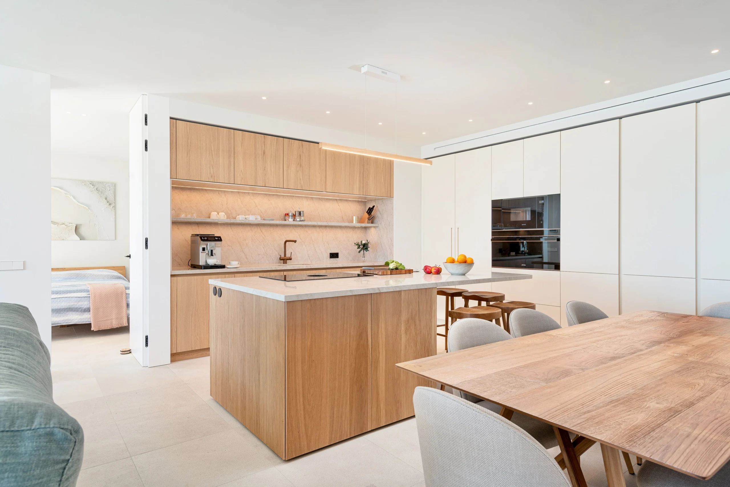 The sleek, fully equipped kitchen features an elegant island with a breakfast bar — ideal for cooking, socialising, or enjoying a morning coffee. A large wooden dining table creates a warm and welcoming setting for shared meals with family and friends.