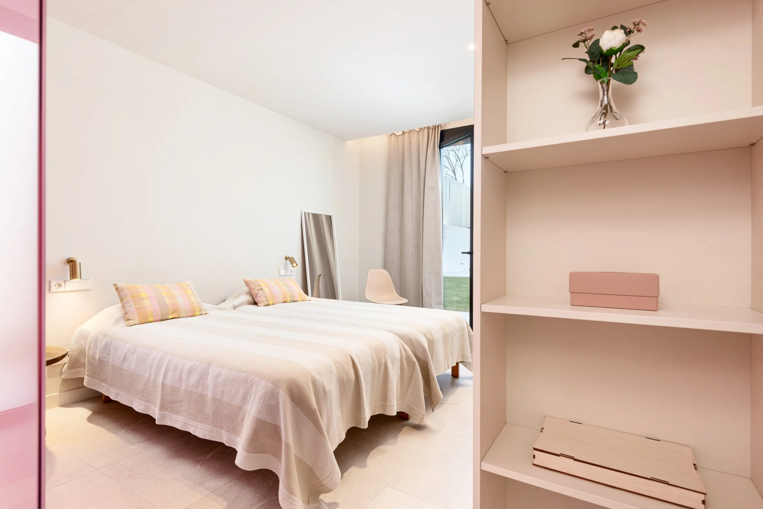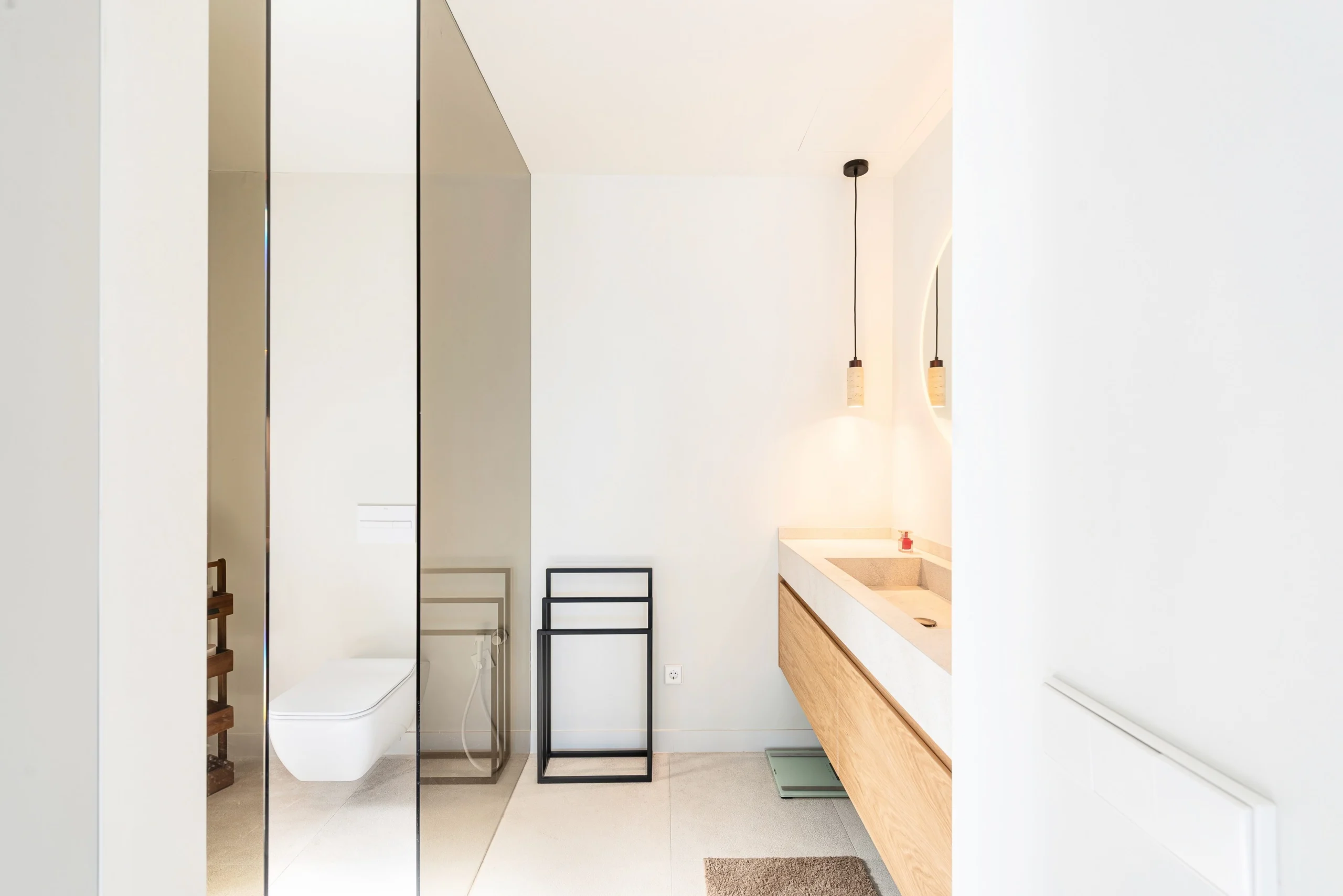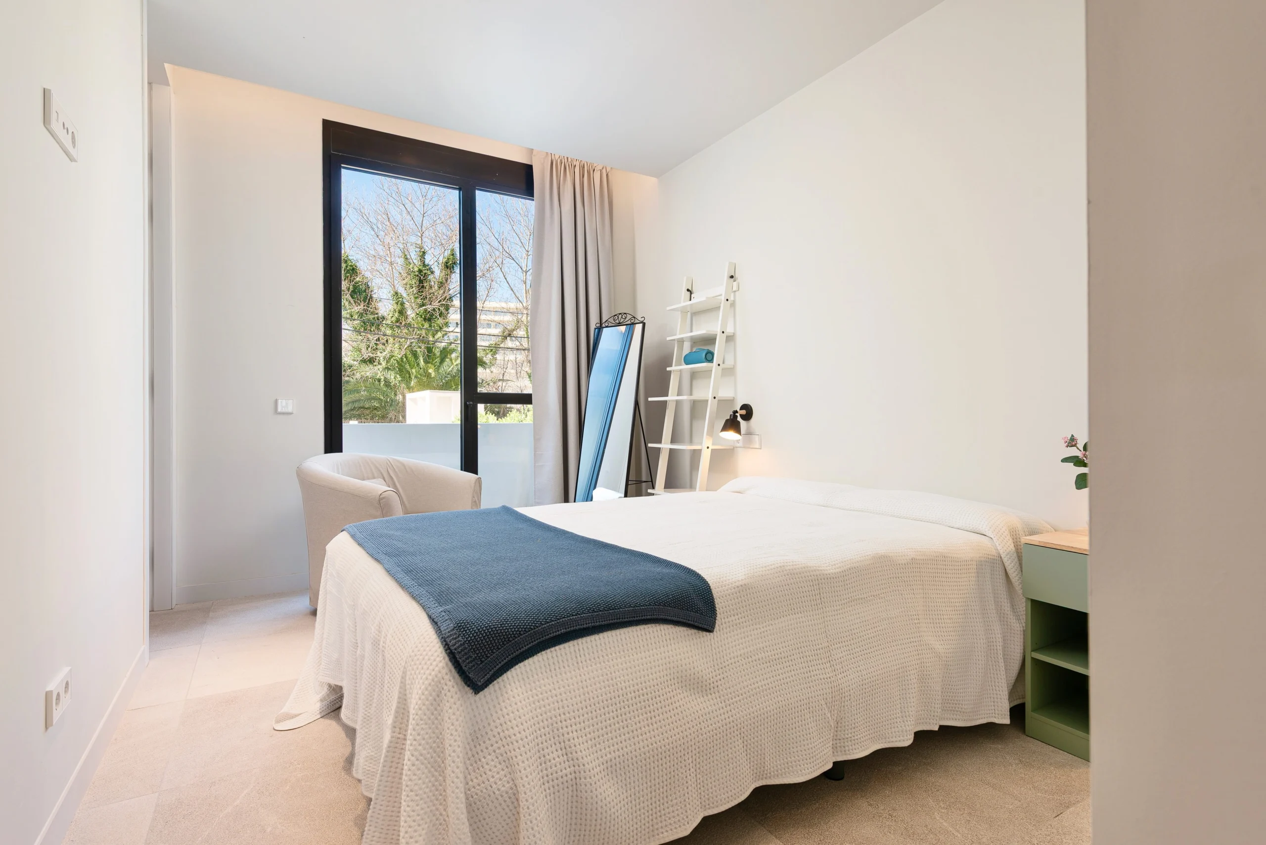 Step inside to discover a bright, thoughtfully curated space where natural light pours in through large windows, illuminating a soothing palette of whites and warm beige tones, complemented by elegant wooden accents.